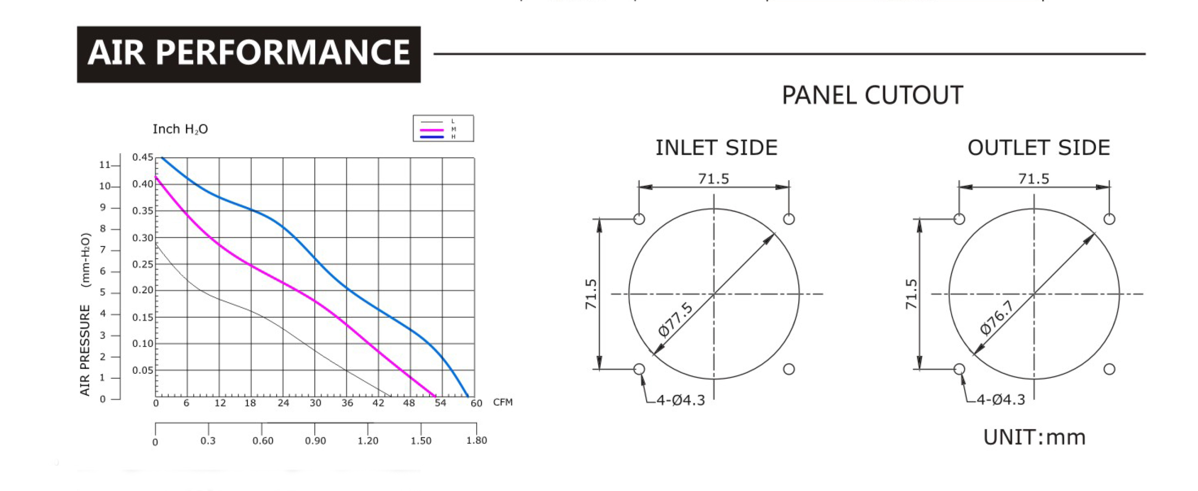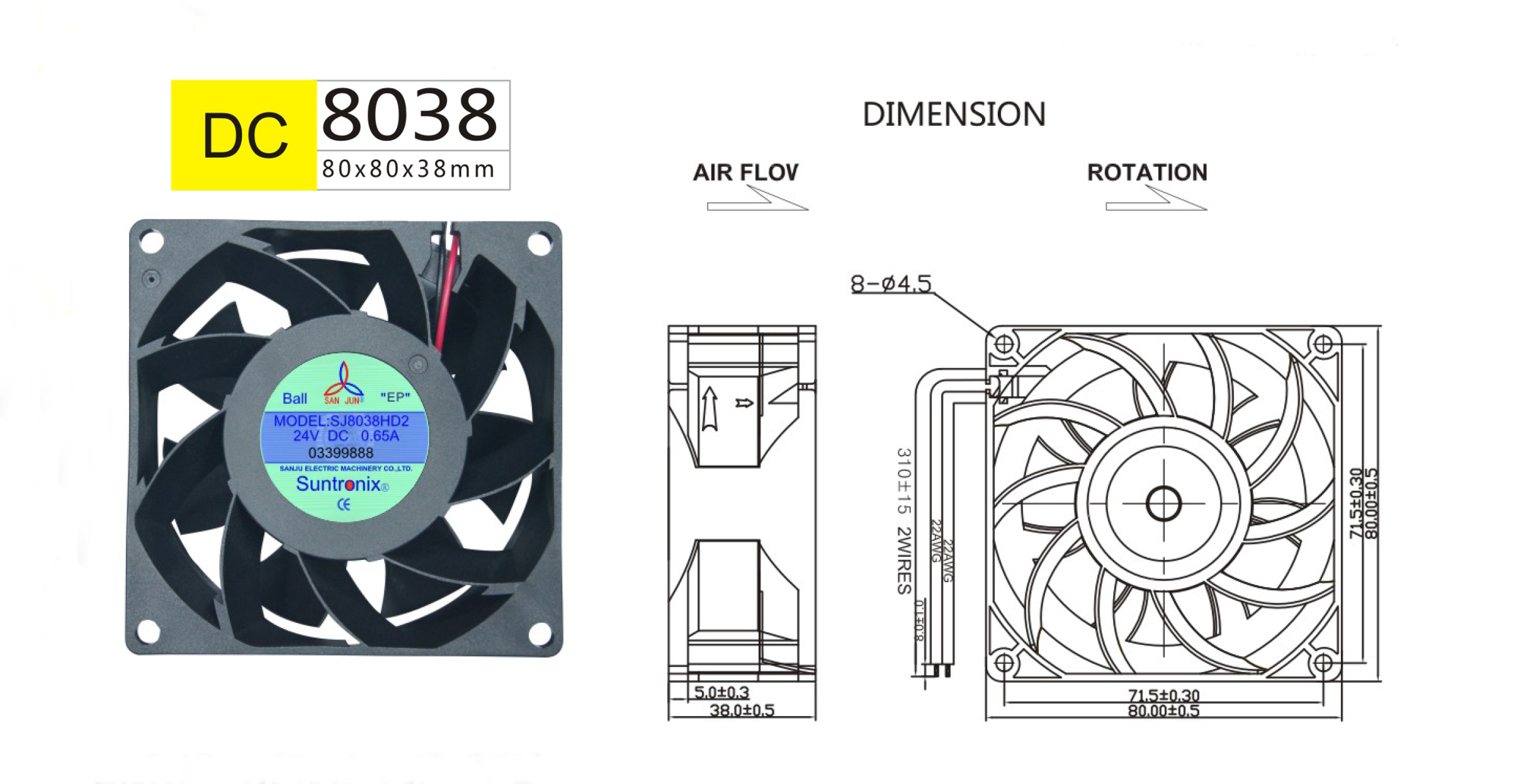尺寸:80x80x38mm 框架: UL94V-0 PBT 軸承: 含油軸承& 雙滾珠軸承 電壓:DC 5V 12V 24V 48V 壽命:50 000Hours at 25℃--滾珠軸承 30 000Hours at 25℃--含油軸承 工作溫度:-20℃~70℃ 正常濕度 儲存溫度:-20℃~85℃ 正常濕度